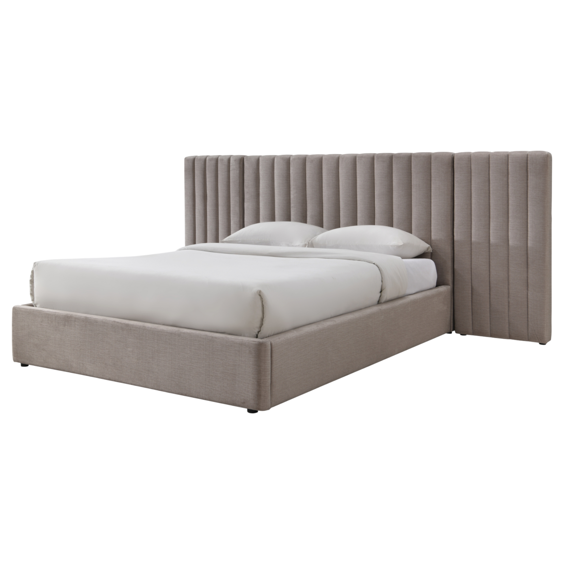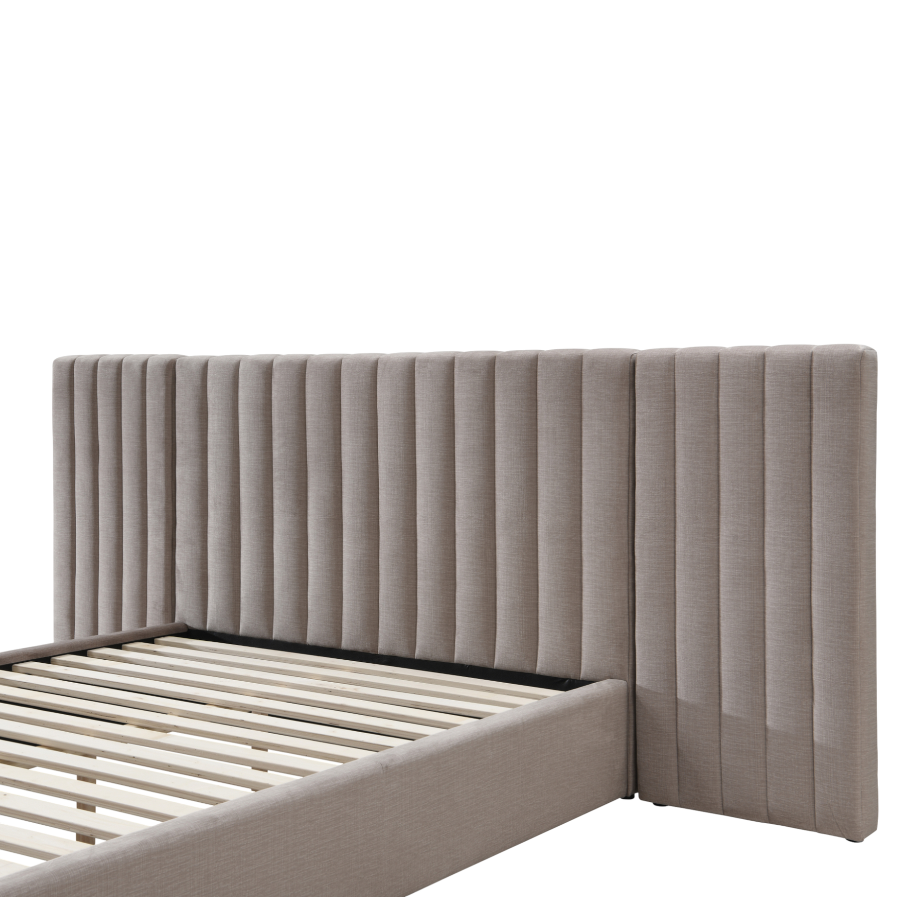 Vertical channelling runs the full length of the bedhead, elongating the wall visually and drawing the eye upward to enhance a sense of height and proportion within the room.