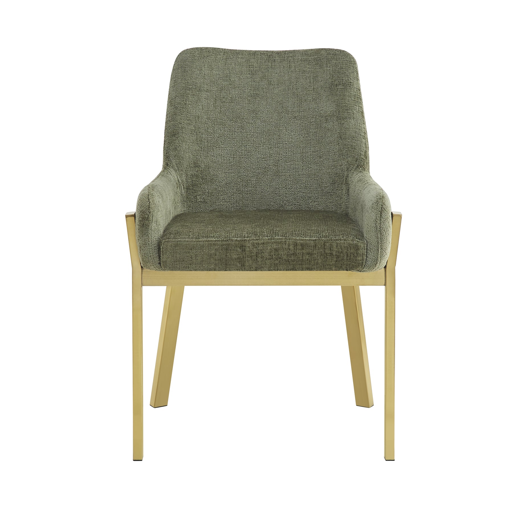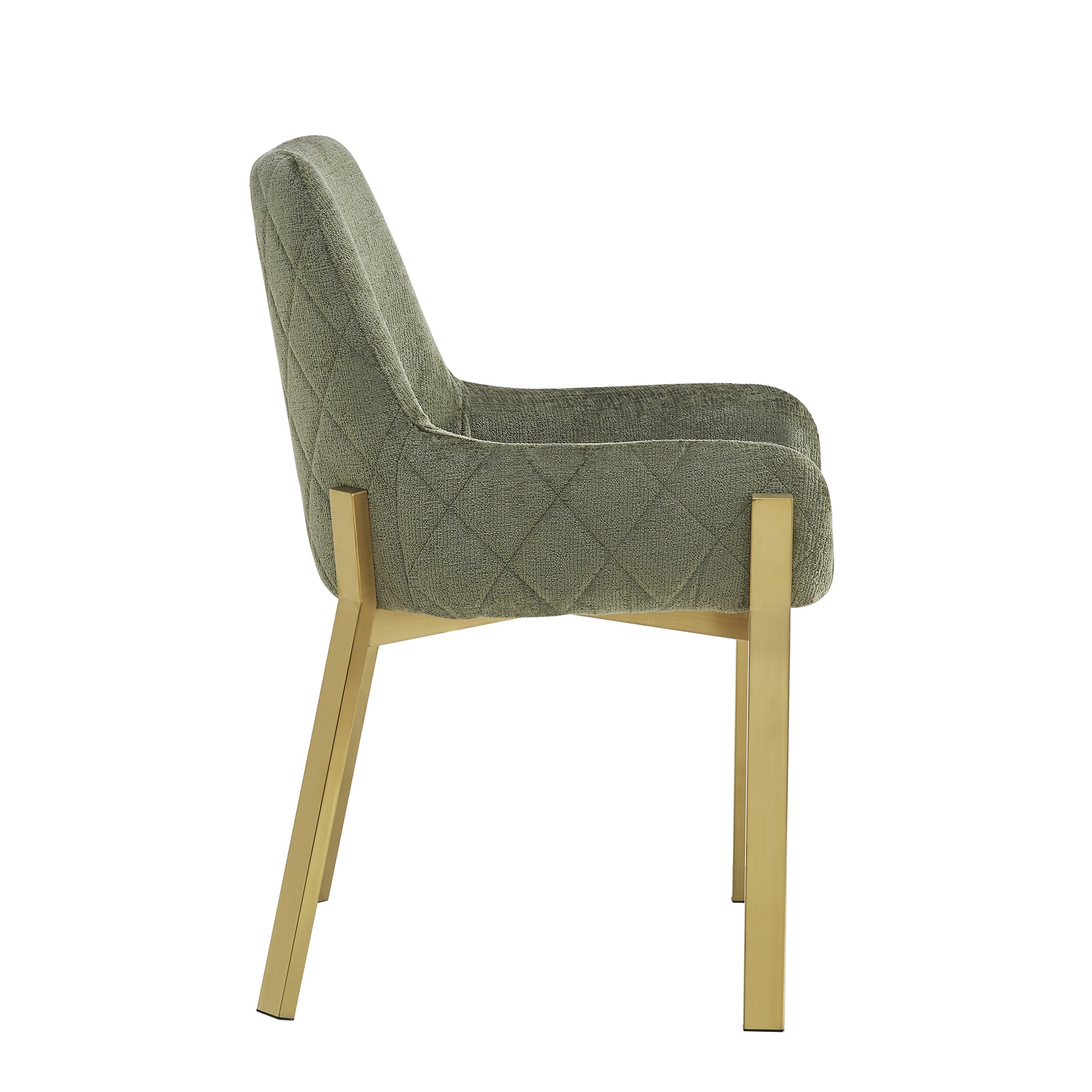 The sturdy, robust frame in a brushed gold finish adds modern glamour and architectural presence. Elegant diamond stitching along the sides introduces a tailored, sophisticated detail that elevates any dining space.
