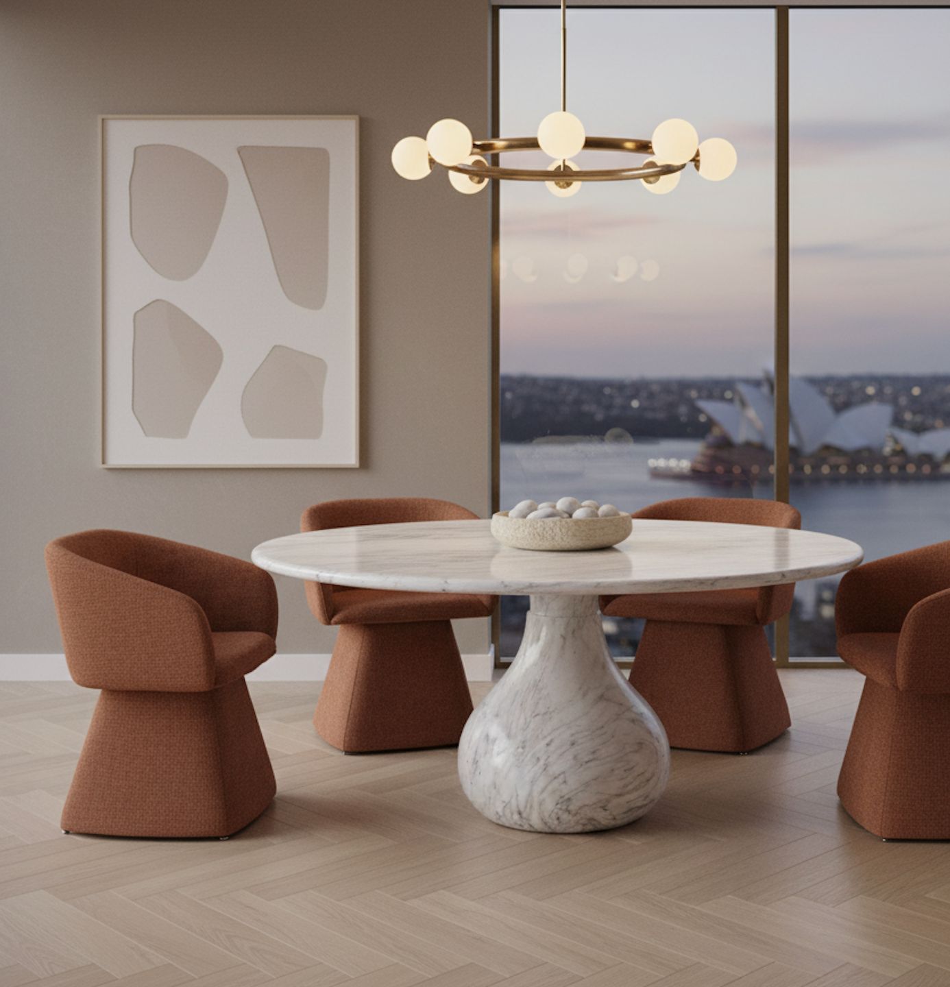 The Toscana Chair is a statement dining chair that blends sculptural design with everyday comfort. Its distinctive pyramid base creates a bold architectural silhouette, anchoring your dining space with modern elegance. Wrapped in a rich, high‑quality textured fabric, the Toscana delivers a soft, tactile hand while resisting everyday wear—perfect for busy dining rooms and open‑plan kitchens. A supportive curved back and generously cushioned seat invite lingering over long dinners, while the concealed swivel mechanism adds a unique, functional twist: effortless 360° movement for easy conversation and seamless access to the table.