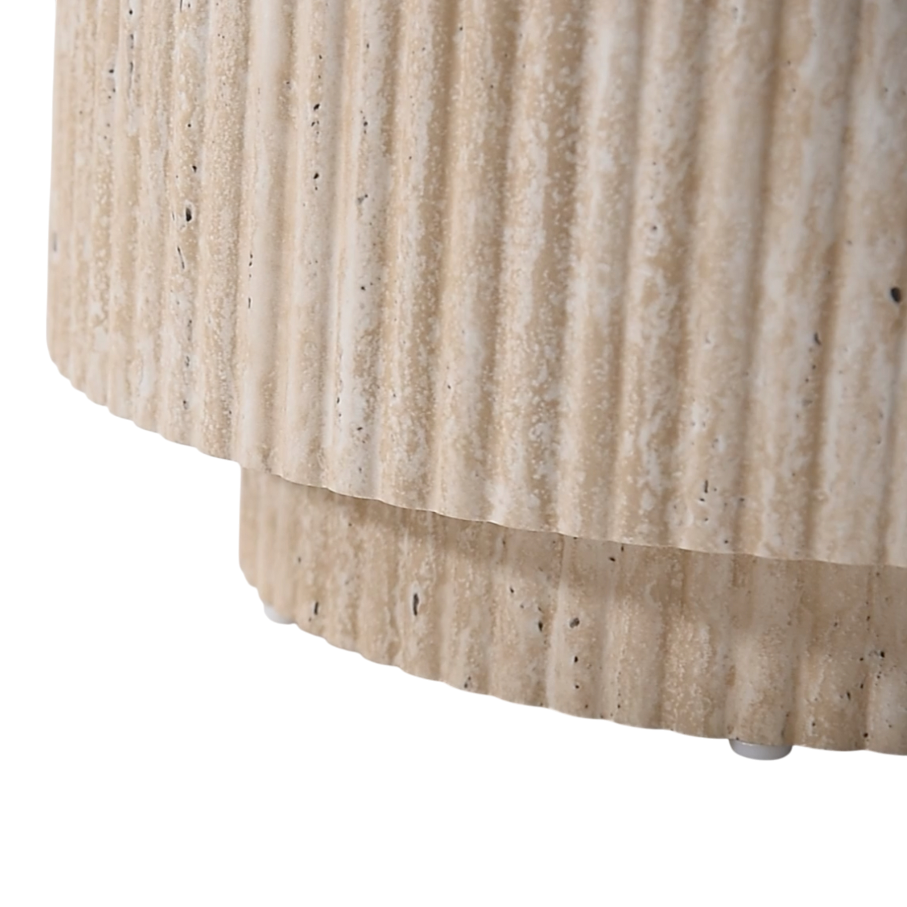 Its distinctive ribbed frame creates subtle shadow play and visual depth, giving the table a sculptural quality from every angle. Finished in a rich, textured travertine look, the surface has all the warmth and character of natural stone. The top is crafted from real stone with a faux travertine wrap, so it both looks and feels like genuine travertine while offering excellent durability for everyday use.
