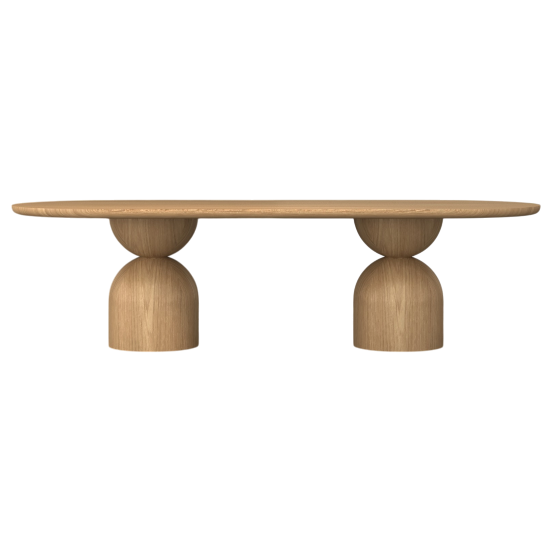 Crafted from the finest high-quality Oak veneers, the table showcases a flawless grain continuity that speaks to an uncompromising level of artisanal precision. Its most arresting feature is the pair of extraordinary pedestal bases; these hourglass-inspired silhouettes provide a robust, sturdy foundation while serving as a bold visual anchor.